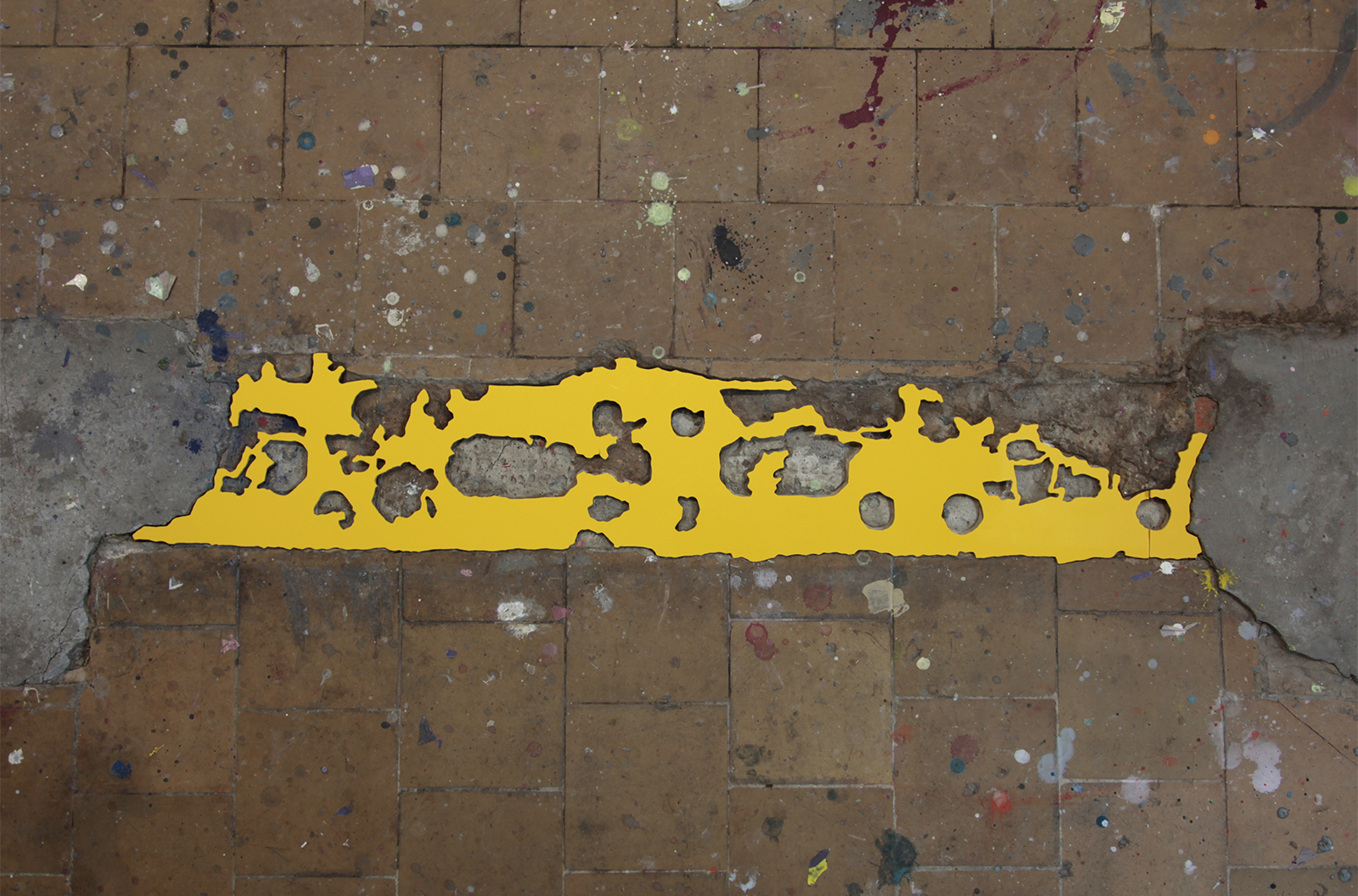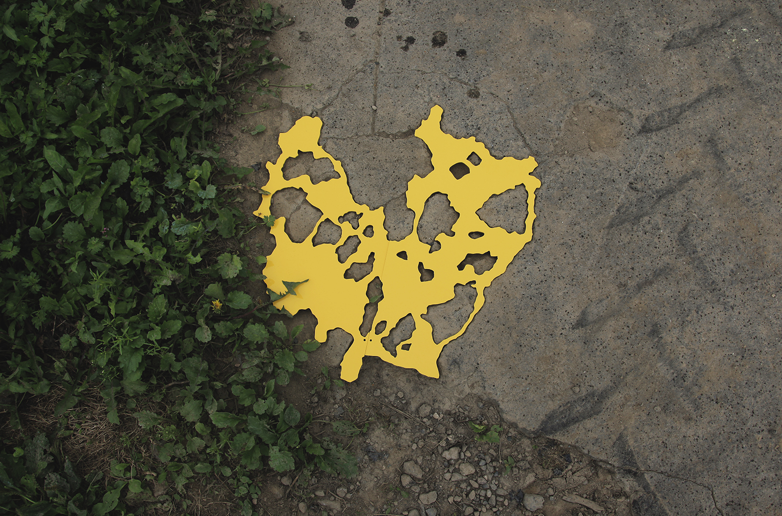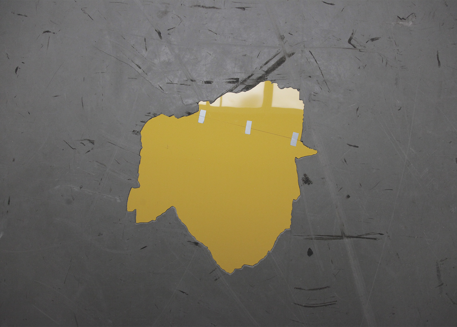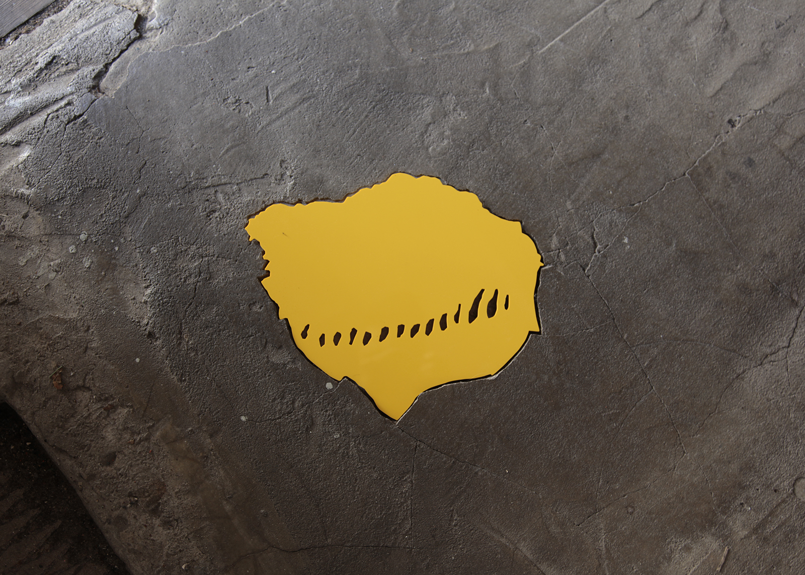 道路、建物の外壁、内壁、床、廊下、天井など凹みは至るところにあります。その中でも気に入ったものを見つけると、その輪郭を透明フィルムに写し取っていきます。それをもとにPVCで制作した凸型となる平面のオブジェクトを、実際の凹みにはめ込んでみます。世界に一つしかない鍵が、その鍵穴にカチリとはまり込むドラマチックな瞬間です。空白を埋めることで、逆に空白の形が浮かび上がり、失われた部分のストーリーに思いを馳せるときでもあります。