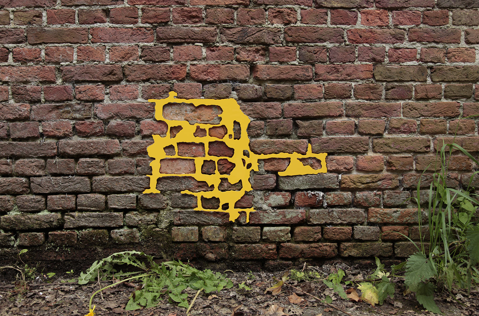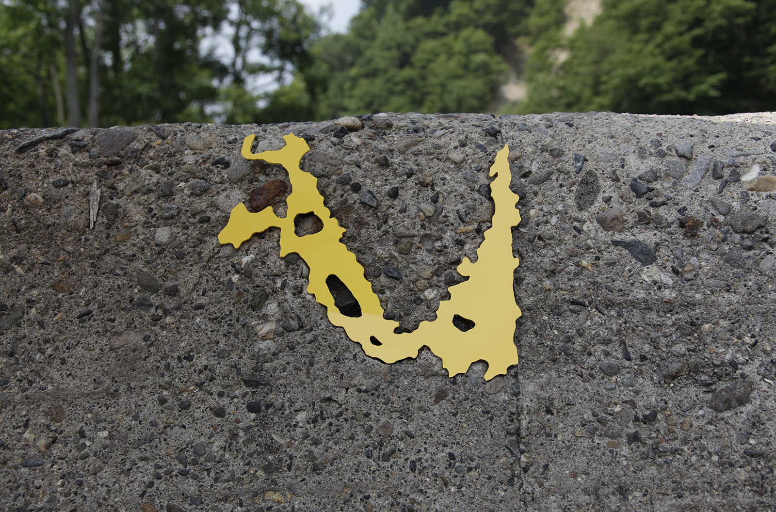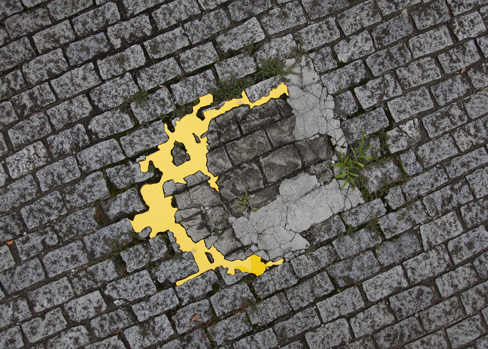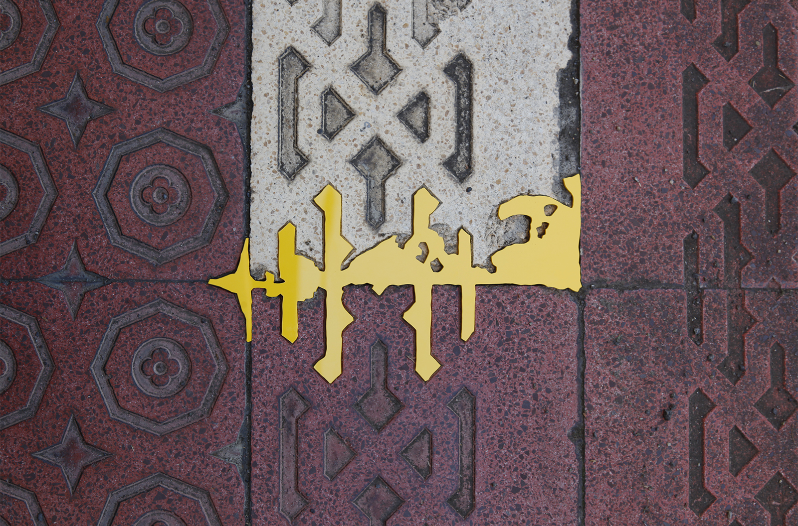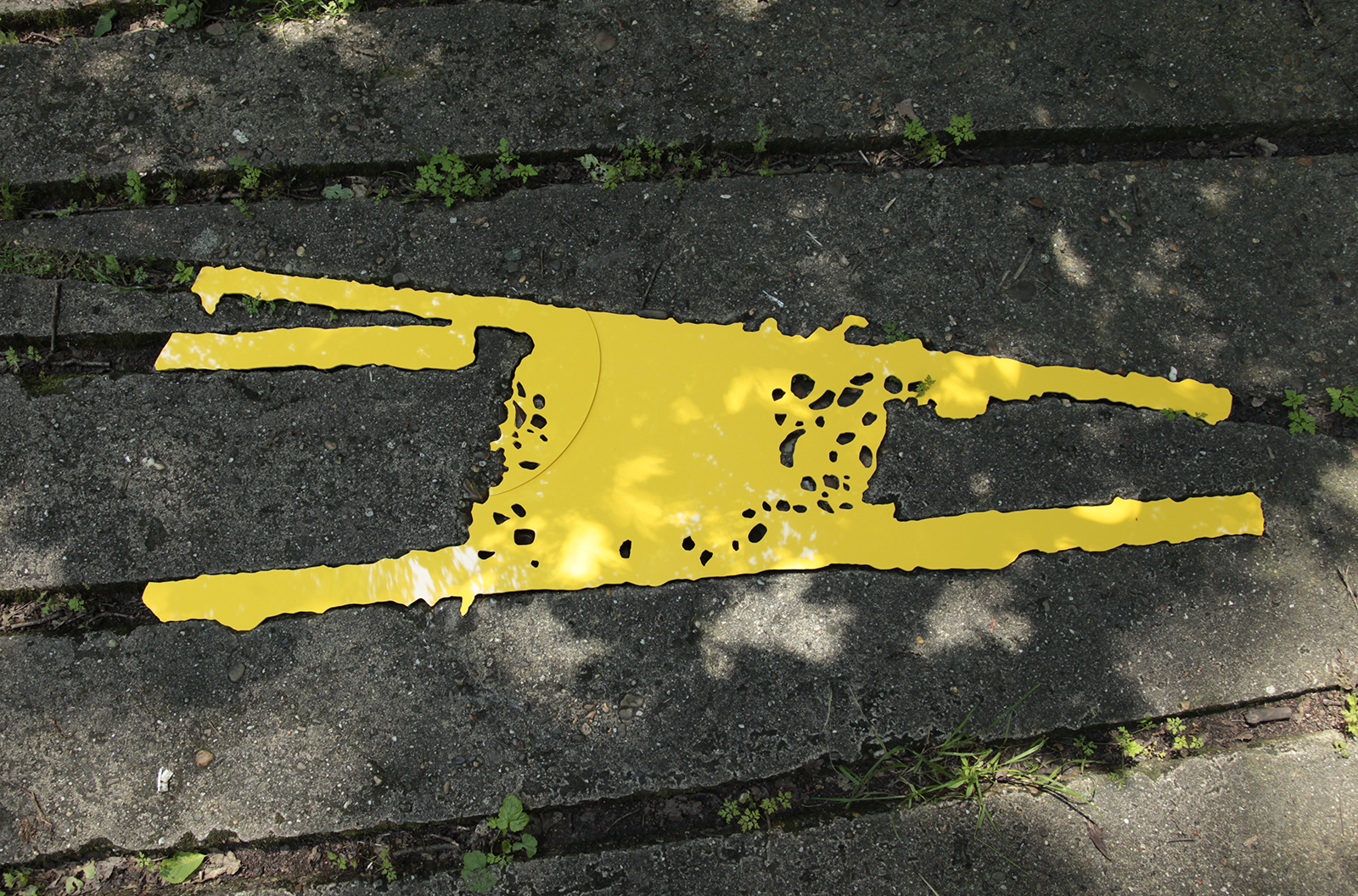 道路、建物の外壁、内壁、床、廊下、天井など凹みは至るところにあります。その中でも気に入ったものを見つけると、その輪郭を透明フィルムに写し取っていきます。それをもとにPVCで制作した凸型となる平面のオブジェクトを、実際の凹みにはめ込んでみます。世界に一つしかない鍵が、その鍵穴にカチリとはまり込むドラマチックな瞬間です。空白を埋めることで、逆に空白の形が浮かび上がり、失われた部分のストーリーに思いを馳せるときでもあります。