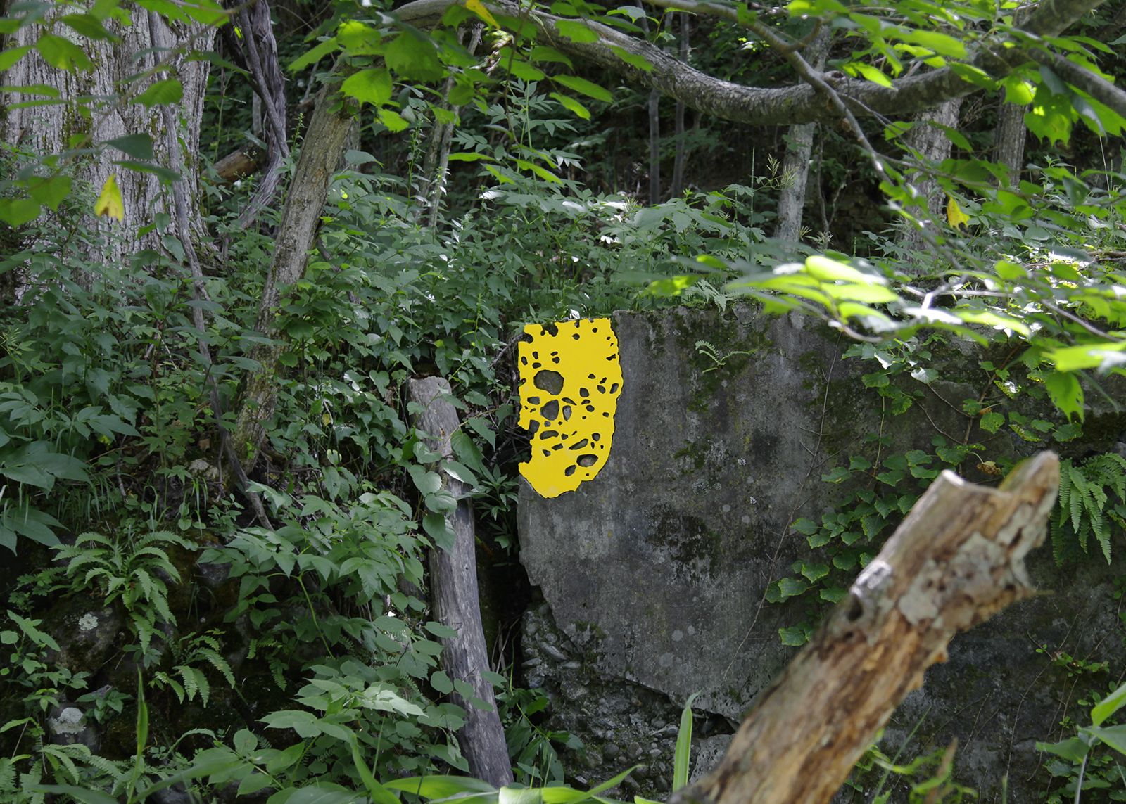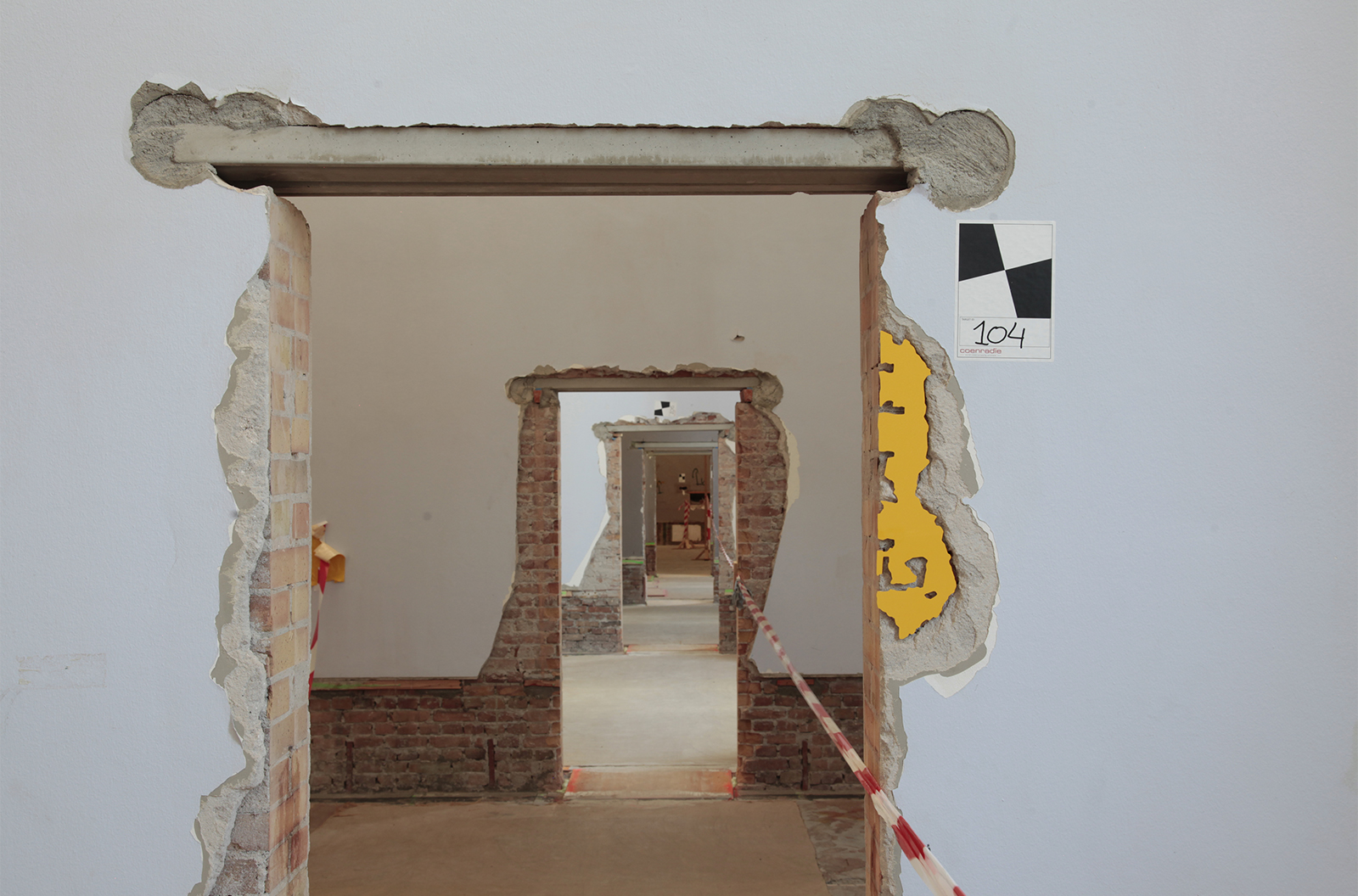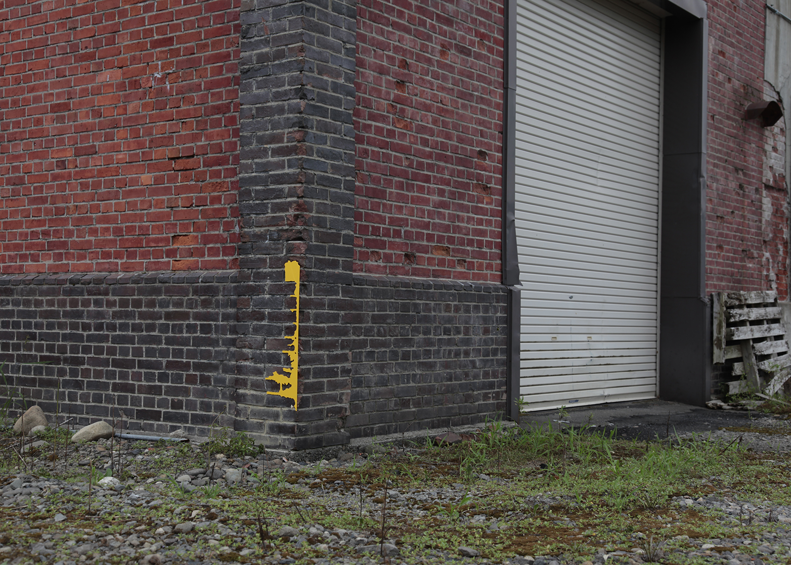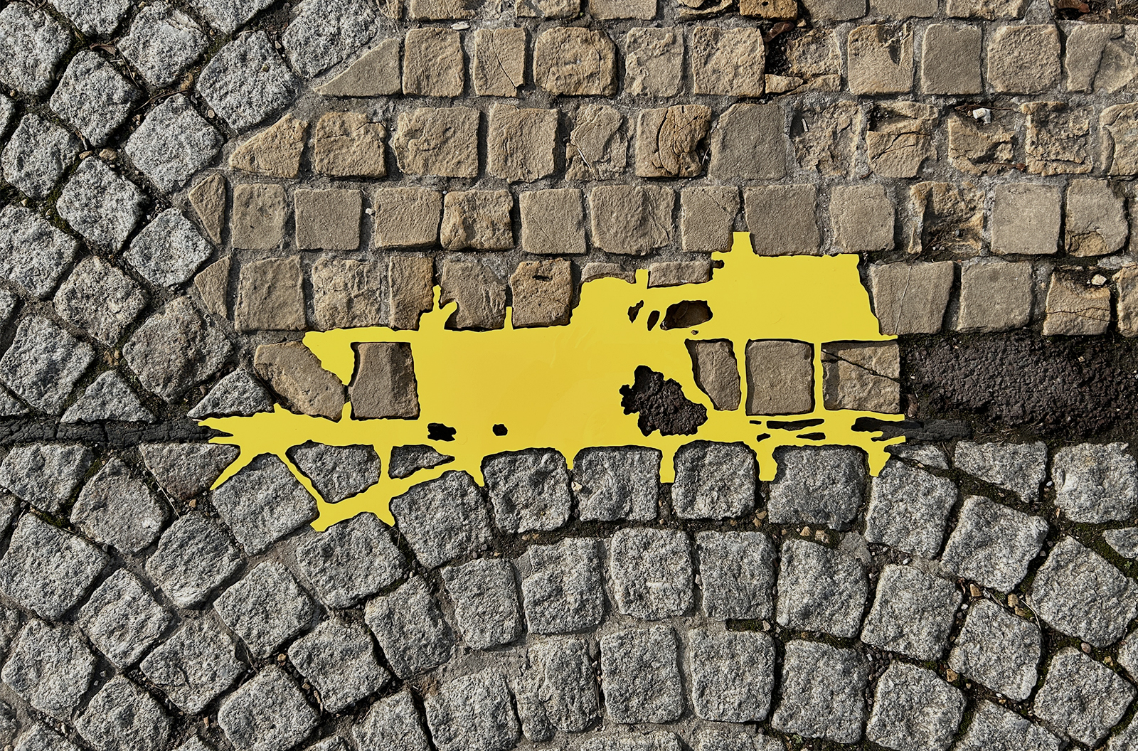 道路、建物の外壁、内壁、床、廊下、天井など凹みは至るところにあります。その中でも気に入ったものを見つけると、その輪郭を透明フィルムに写し取っていきます。それをもとにPVCで制作した凸型となる平面のオブジェクトを、実際の凹みにはめ込んでみます。世界に一つしかない鍵が、その鍵穴にカチリとはまり込むドラマチックな瞬間です。空白を埋めることで、逆に空白の形が浮かび上がり、失われた部分のストーリーに思いを馳せるときでもあります。